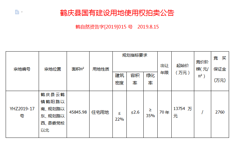 九、报名时间及资格确认:申请人可于2019年8月15日至2019年9月04日到鹤庆县自然资源局向我局提交书面申请。经审核,申请人按规定交纳竞买保证金,具备申请条件的,我局将在2019年9月04日17时00分前确认其竞买资格。