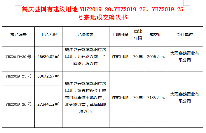 鹤庆县两宗地块分别以2006万、7186万元成交