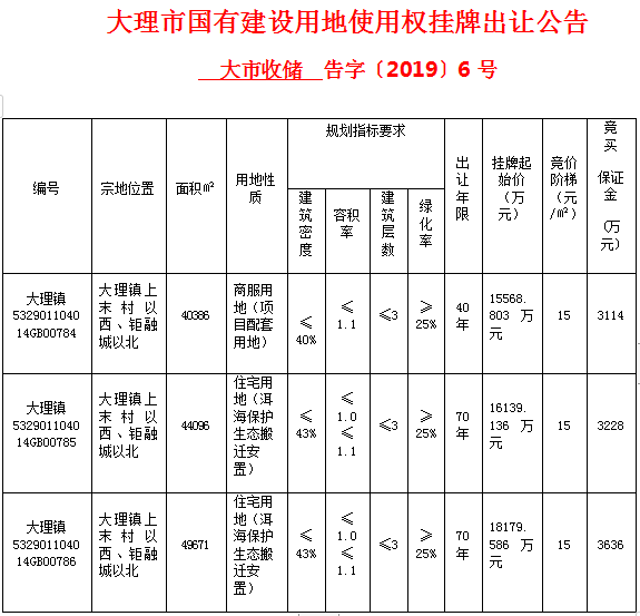 四、本次挂牌出让的详细资料和具体要求,见挂牌出让文件,申请人可于 2019年8月30日至 2019年9月18日,到泰安南路大理市土地收购储备交易中心获取,并需要在平台注册及办理数字CA证书方可参与竞买,访问大理州公共资源电子服务系统:www.dlggzy.cn,查看相关出让信息。