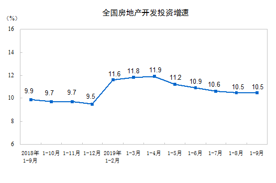2019年1—9月份,全国房地产开发投资98008亿元,同比增长10.5%,增速与1—8月份持平。其中,住宅投资72146亿元,增长14.9%,增速持平。