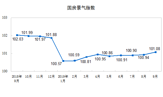9月份,房地产开发景气指数(简称“国房景气指数”)为101.08,比8月份提高0.14点。