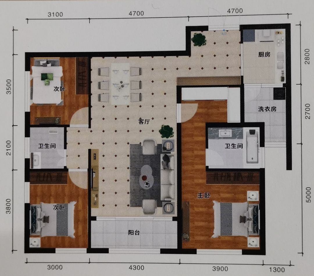 3、C1栋C户型,三室两厅两卫,建面约139㎡。