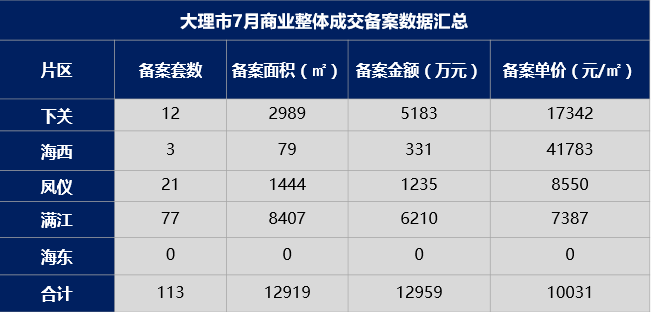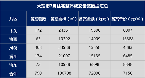 住宅:7月住宅成交备案主要还是集中在下关片区、凤仪片区以及满江片区,住宅备案面积100708㎡,环比下降4%,备案均价7150元/㎡,环比下降15.4%。