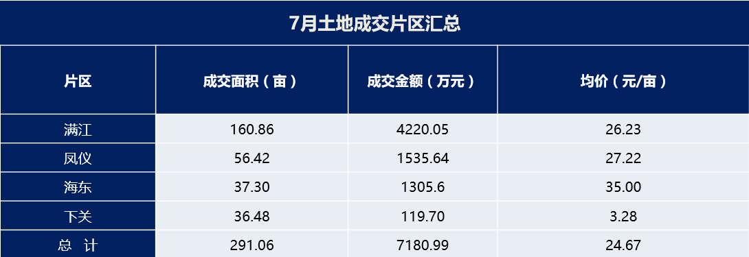 2、7月份成交12宗土地,科教用地154.61亩;工业用地65.17亩;其它商服用地42.58亩;医疗用地20.01亩;机关团体用地801亩;其它普通商品住房用地0.59亩。其中满江片区成交160.89亩,占总成交比58.77%;凤仪片区成交56.42亩,占总成交比21.38%;海东片区成交土地37.30亩,占总成交比18.18%。下关片区成交土地36.48亩,占总成交1.7%。住房用地成交相对较低,其中下关片区成交拉低整体价格(划拨用地)。