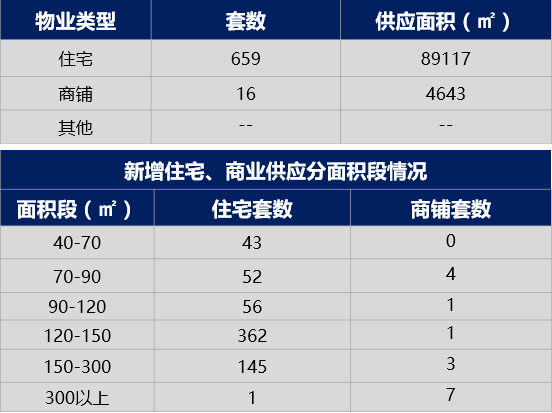 9月新增物业类型住宅和商铺皆有,整体新增住宅供应面积89117㎡,环比上涨194.4%,主要供应面积段为120-150㎡;商业新增供应面积为4643㎡,主要供应区间段为300㎡以上。