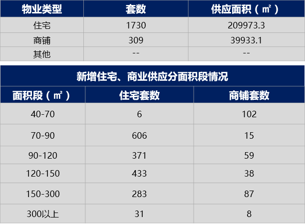 11月新增物业类型住宅和商铺皆有,共计2039套,整体新增住宅供应面积209973㎡,共计1730套,环比上涨771.9%,主要供应面积段为70-150㎡;商业新增供应面积为39933㎡,共计309套,环比上涨约19倍,主要供应区间段为70㎡以内。