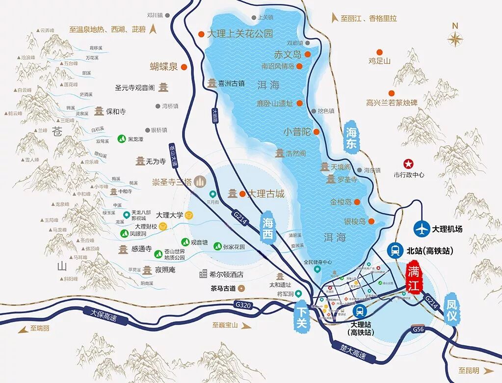随着大理行政中心逐渐东移,满江片区以其沟通下关、海东、开发区的枢纽门户位置,承担起未来大理政治、经济以及生态、教育、休闲、商务中心。高铁新城总占地3000余亩,是云南第二大综合交通枢纽,洱海高铁站可停靠40辆列车,年旅客吞吐量超百万,涵盖产业制造、综合商业、休旅度假、配套住宅等业态,满江成为大理发展最快、潜力最足、最具吸引力的片区。