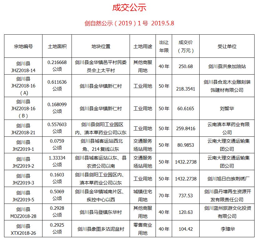 剑川县10宗国有土地使用权挂牌出让成交公示,其中住宅用地一幅