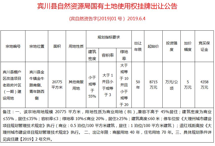 宾川县挂牌出让一宗商服用地使用权,属棚户区改造项目