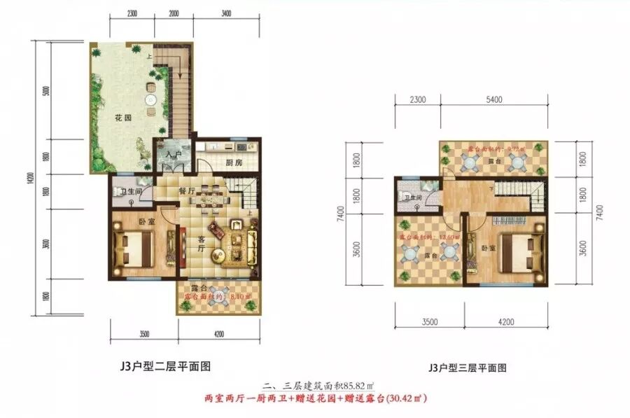 叠加别墅/建筑面积85.82㎡/两室两厅一厨两卫+赠送花园+赠送露台